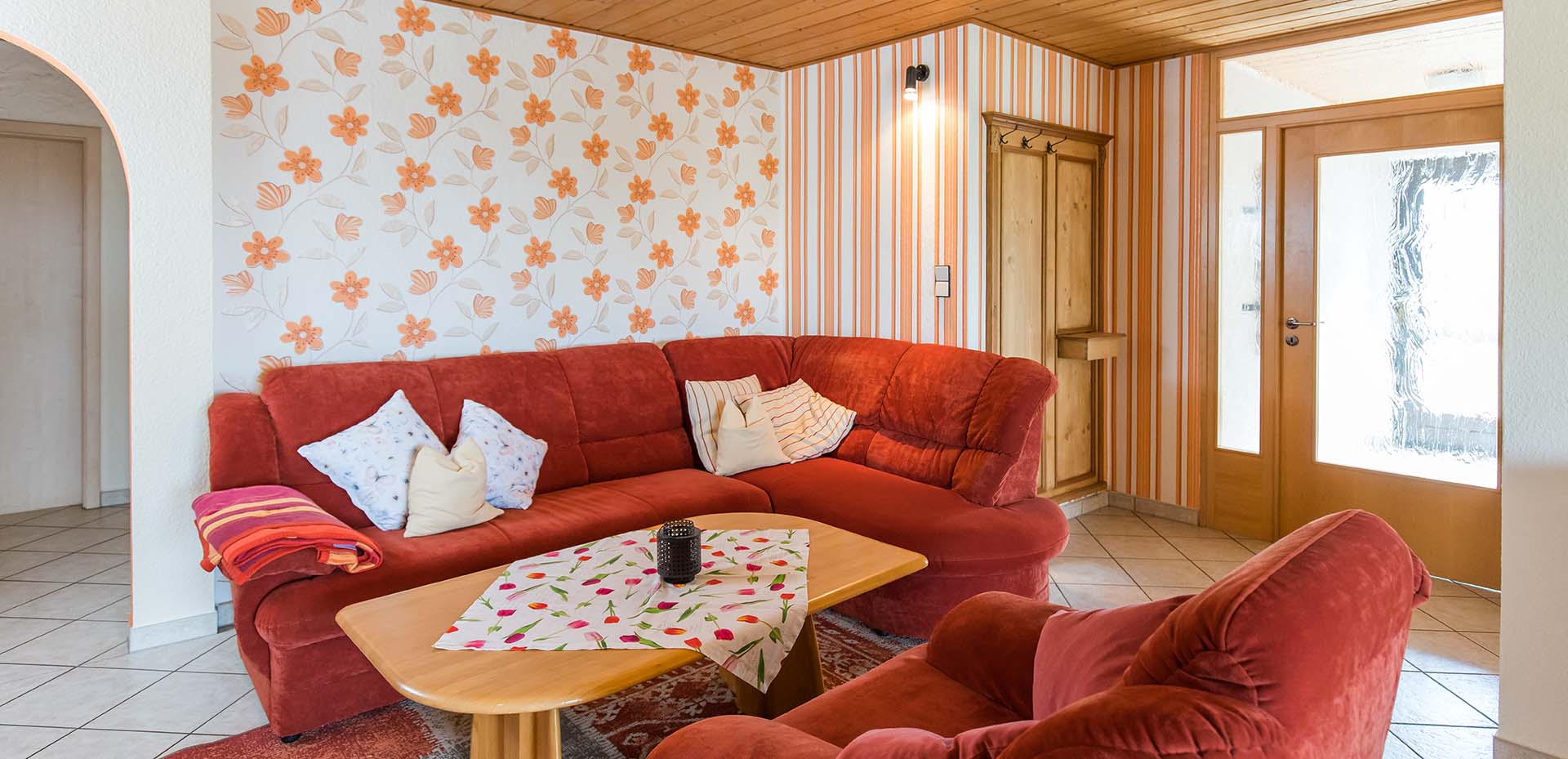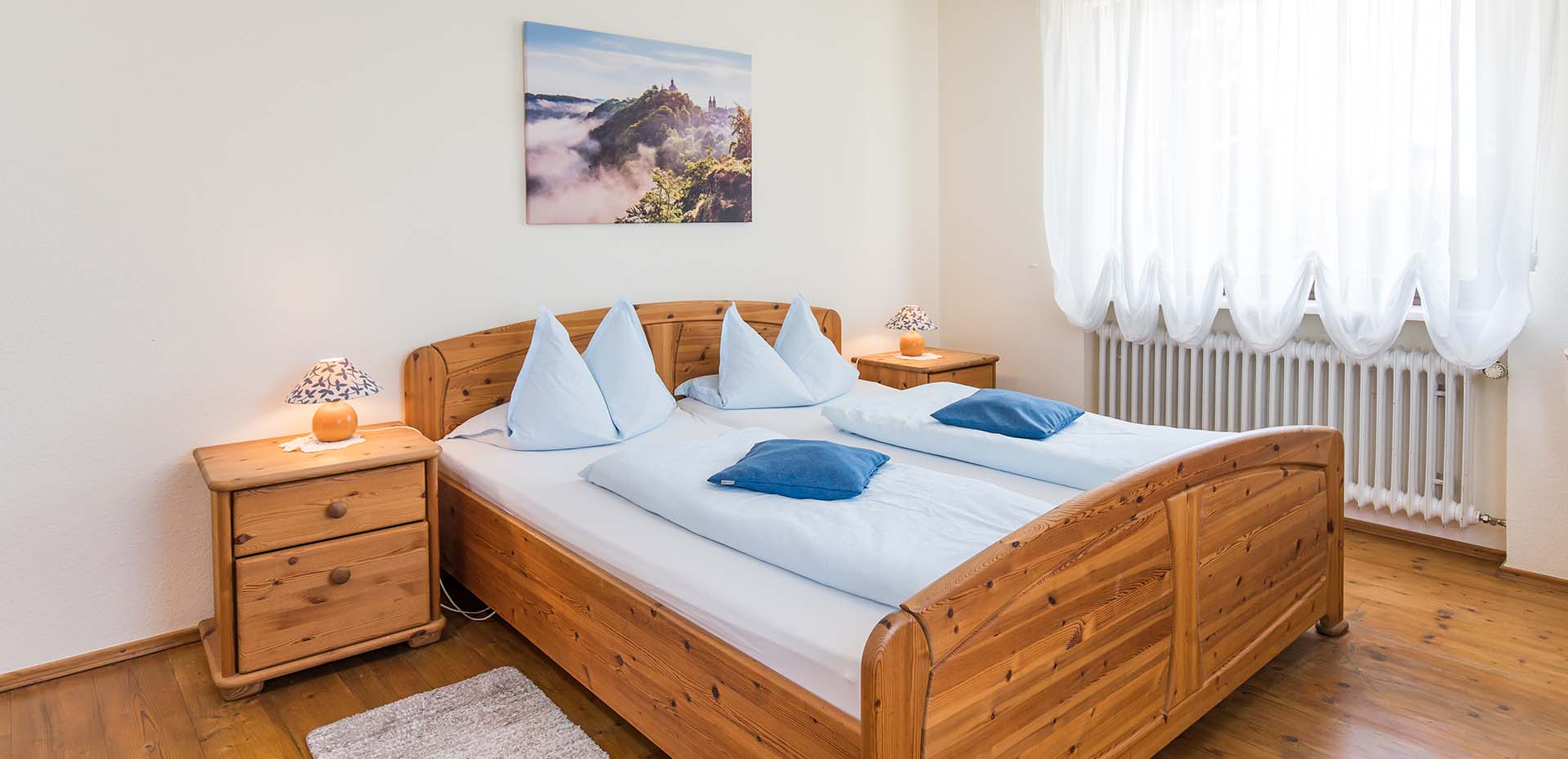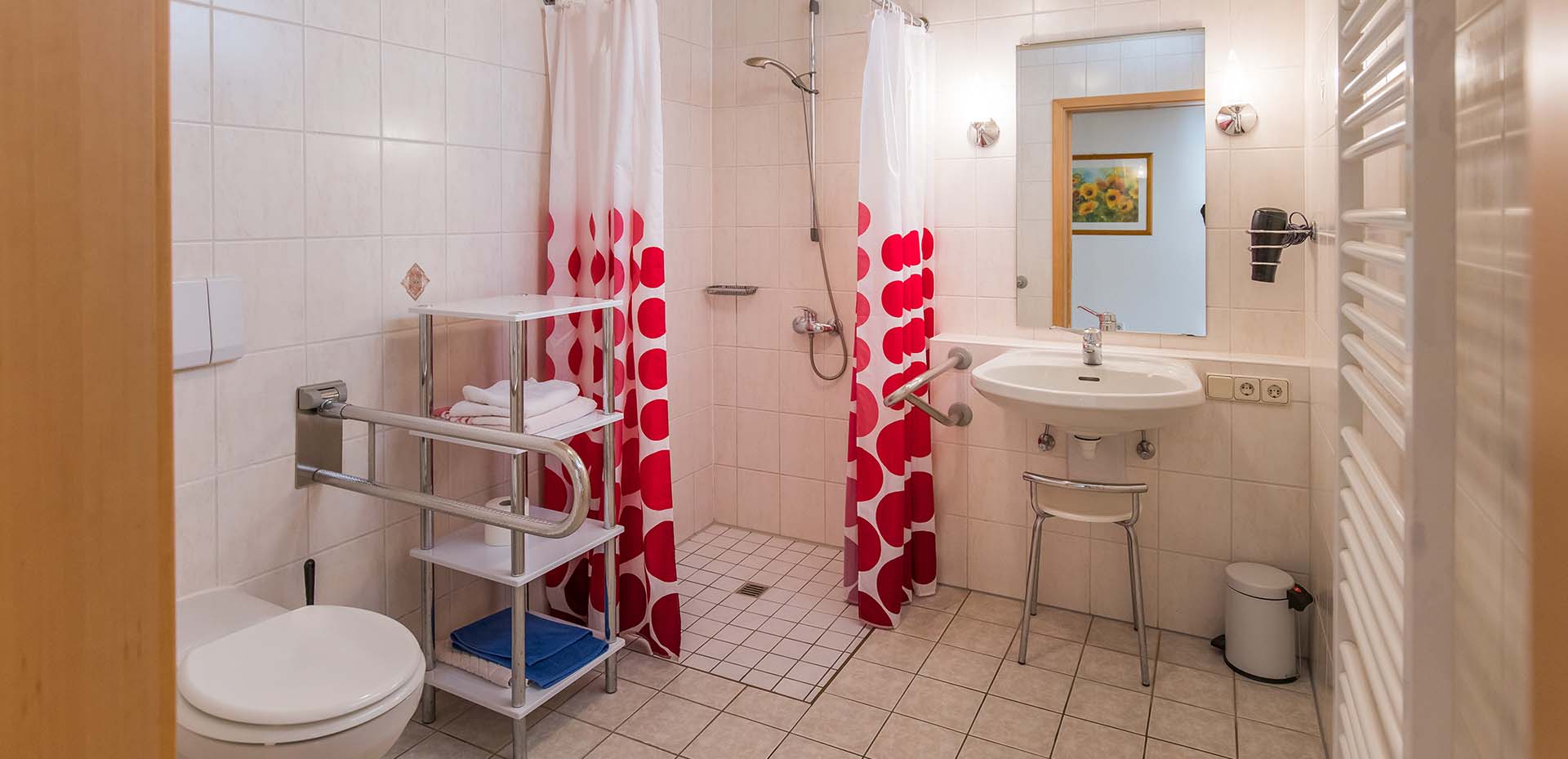 Diese 100 qm große Ferienwohnung bietet einen schönen Blick ins Tal, eine eigene Terrasse und ist durch den ebenerdigen Eingang und ein entsprechend eingerichtetes Badezimmer behindertengerecht. Darüber hinaus verfügt die Wohnung über drei Schlafzimmer, einen großzügigen Wohnraum, zwei Bäder (davon eines mit Toilette), ein separates WC, eine große Diele, eine Küche mit Spülmaschine und Microwelle, sowie TV und Telefon